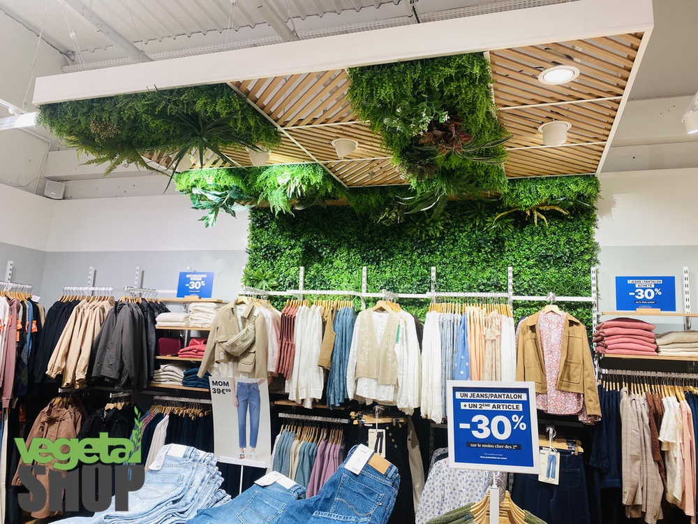 La dalle de plafond végétal ignifugé pour magasin, commerce et boutique transforme immédiatement votre point de vente en un espace moderne, attractif et différenciant. Inspirée des concepts utilisés par des enseignes comme Bonobo, elle apporte une touche naturelle et tendance qui capte l’attention dès l’entrée.