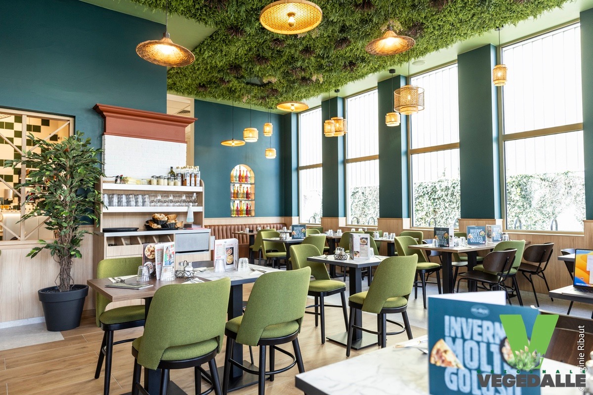 Dans un restaurant Del Arte, l’expérience client commence bien avant l’assiette. Avec un plafond végétal artificiel en dalles Vegedalle 60×60, l’ambiance devient immédiatement plus chaleureuse, plus vivante, plus mémorable.